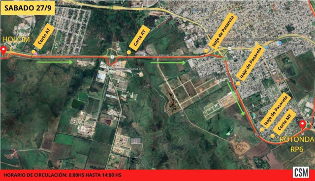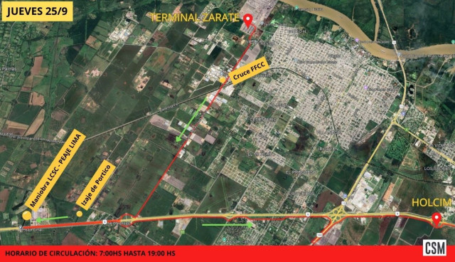 Corredores Viales S.A informa que, debido al traslado de una torre de destilación desde la terminal portuaria de localidad de Zárate hacia Campana, la ruta nacional 9 sufrirá cortes parciales e intermitentes en ambas manos desde el jueves 25 de septiembre hasta el domingo 28 que pueden generar demoras en la circulación.