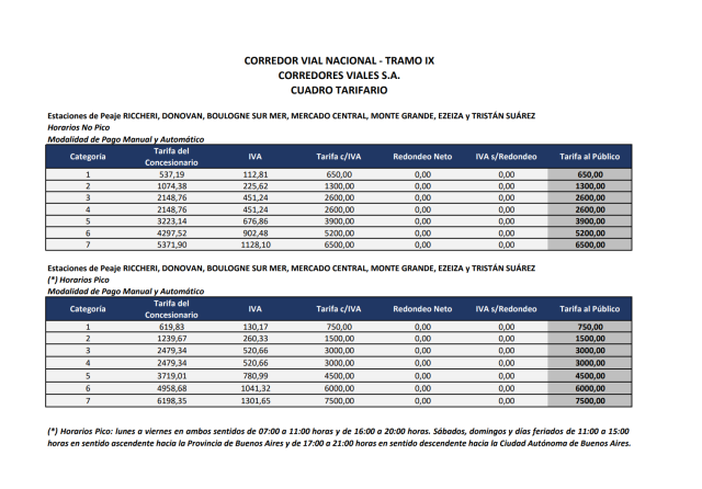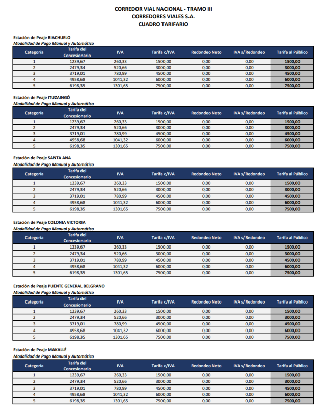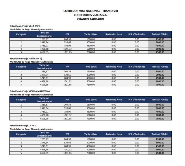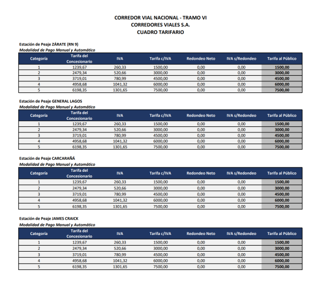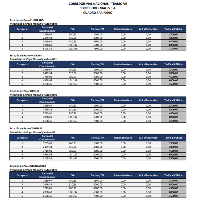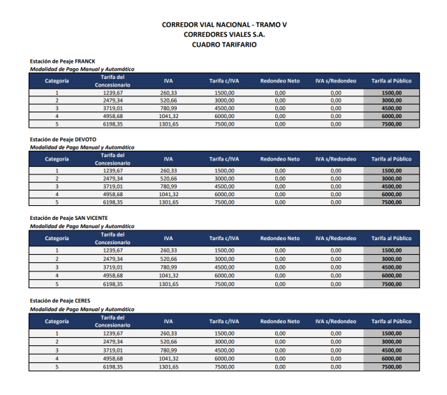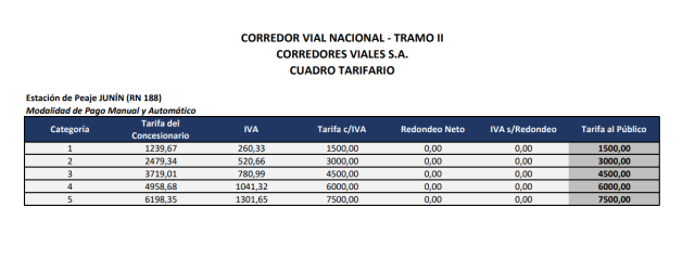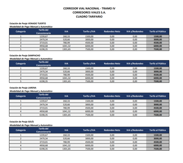 por la empresa concesionaria Corredores Viales S.A. el cual entrará en vigencia